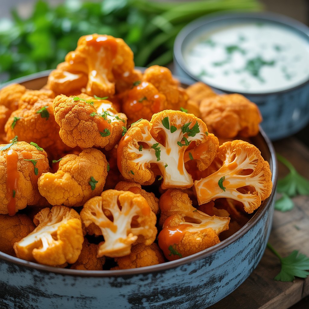 Preheat the air fryer to 375°F (190°C). Place cauliflower in a single layer (cook in batches if needed). Air fry for 12 minutes, flipping halfway, until lightly golden. - Toss in Buffalo Sauce
