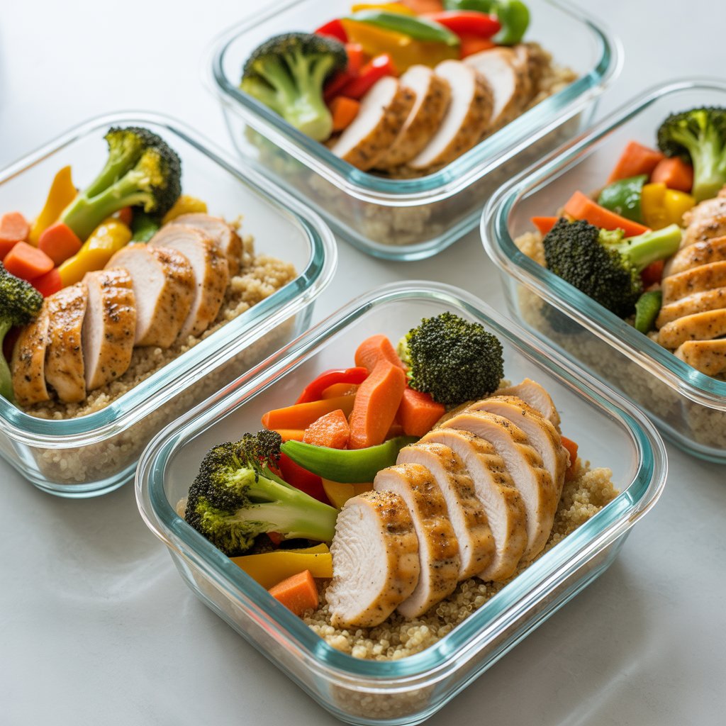 Divide cooked quinoa (or your chosen base) evenly among 4 meal prep containers. Slice the chicken and arrange it over the base. Add roasted vegetables on the side.