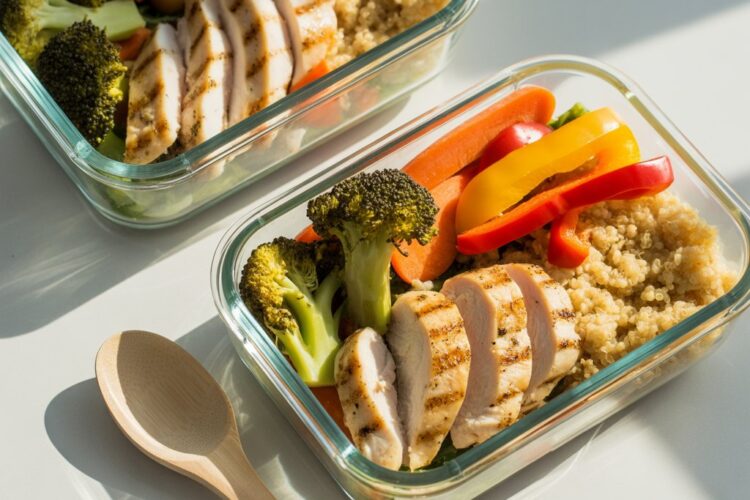 Divide cooked quinoa (or your chosen base) evenly among 4 meal prep containers. Slice the chicken and arrange it over the base. Add roasted vegetables on the side.